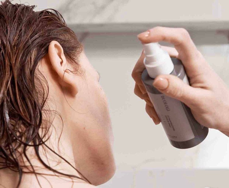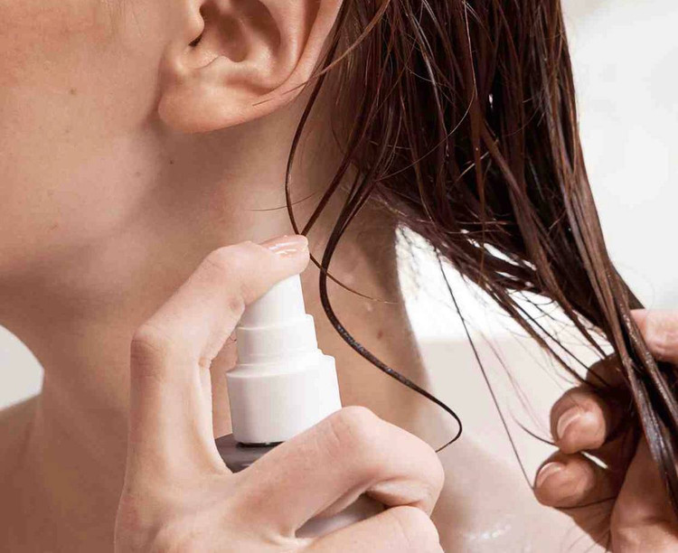 2 تا 4 پمپ را به دست ها (یا مستقیماً روی موها) اسپری کنید، سپس به طور یکنواخت روی موها بمالید، از وسط ساقه مو تا انتها ادامه دهید.