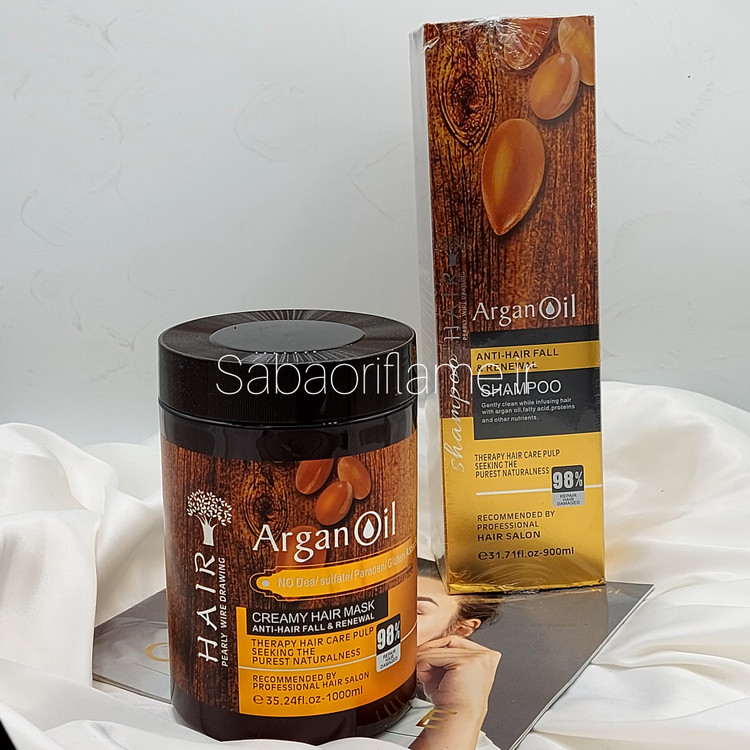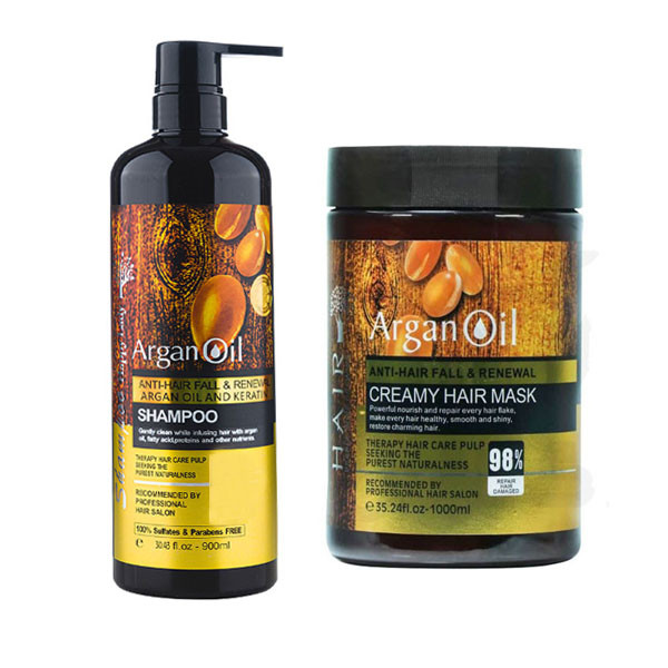 شامپو حاوی روغن آرگان و احیا مو ماسک 98% احیا و روغن ارگان درخشان کننده، براق کننده و شاین دهنده ی مو برای احیا، پاکسازی و تقویت مو ویتامین E و پروتئین های موردنیاز مو کمک به رشد مجدد موها و افزایش حجم بدون سولفات،پاراپن: حجم شامپو: 900 میل حجم ماسک : 1000میل