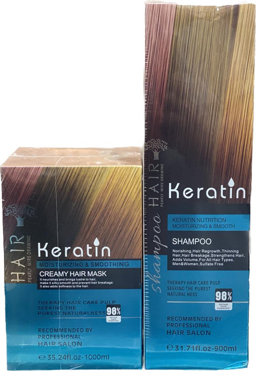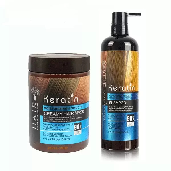 حاوی ۹۸ درصد کراتین خالص و مایع نرم کننده و تقویت کننده مو جلوگیری از موخوره افزایش استحکام مو حاوی پروتیین هیدرولیز شده: حجم ماسک: 1000 میل حجم شامپو :900 میل حجم سرم : 100 میل